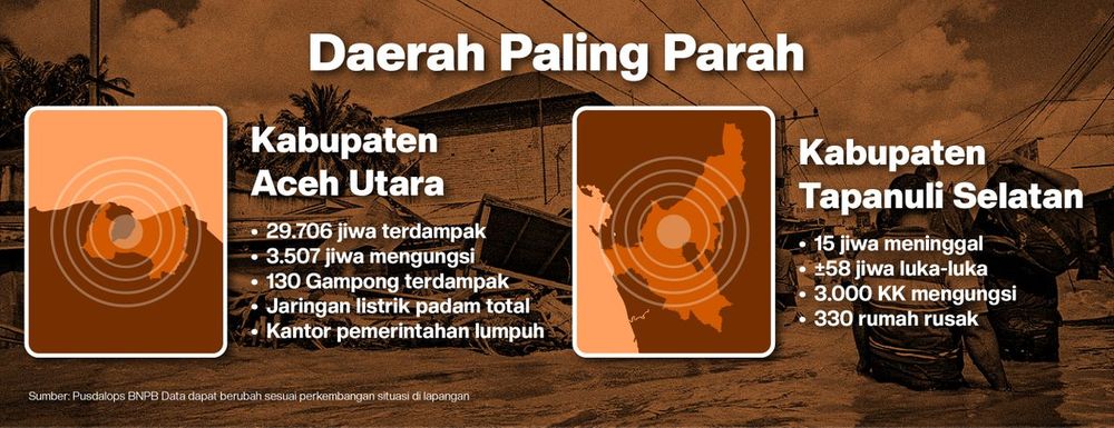 Dari data sementara sebanyak 46.893 jiwa terdampak dan 1.497 orang di antaranya mengungsi. Banjir terparah terjadi di Kabupaten Aceh Timur, Aceh Singkil, dan Aceh Utara.