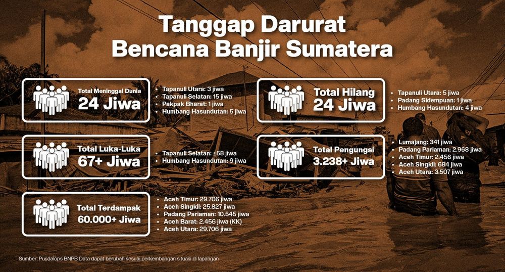 Kepala Pusat Data, Informasi, dan Komunikasi Bencana (Kapusdatin BNPB) Abdul Muhari mengungkapkan data terbaru korban tewas hingga sore ini (Minggu, 30/11/2025) mencapai 441 jiwa.
